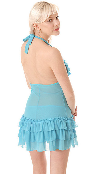 ●ホルターベビードール(調節可)&ハーフバックショーツ●爽やかなサックスブルーカラー●ボリューミーなフリルでメリハリづけ●フロントホック付き。