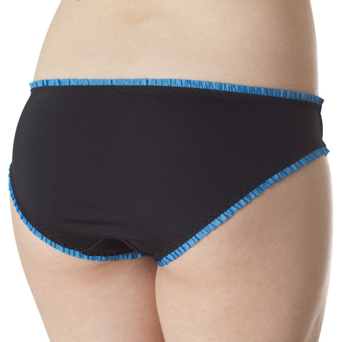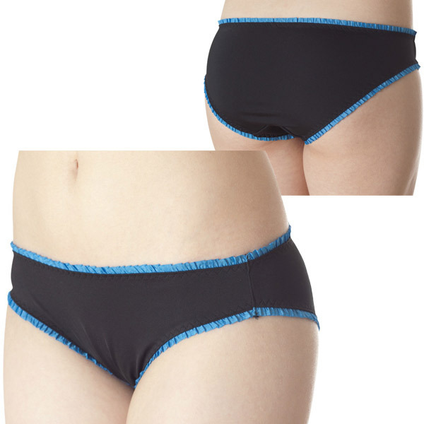 ●ブラック×ブルーの知的カラー●飾りを省いたシンプルデザイン●細かなフリルで上下を縁取り●ナチュラルなフィット感●安心感のある深めの足ぐり。