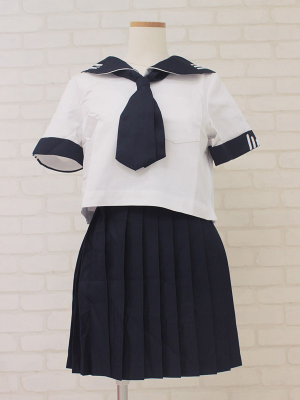 夏服仕様のセーラーブラウスにプリーツスカート、紺色スカーフのセット!セーラー襟と袖のデザインがお洒落なお嬢様風制服コスチュームです。