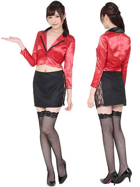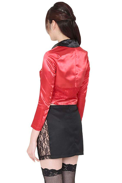 スカートの側面は大胆にもレース素材で肌が見えてしまうセクシーなデザイン!赤のジャケットを素肌に羽織ることで、更にアダルトな魅力を引き出せそうですね♪カジノを彩るディーラー衣装でハロウィンイベントや撮影会にもせひどうぞ!